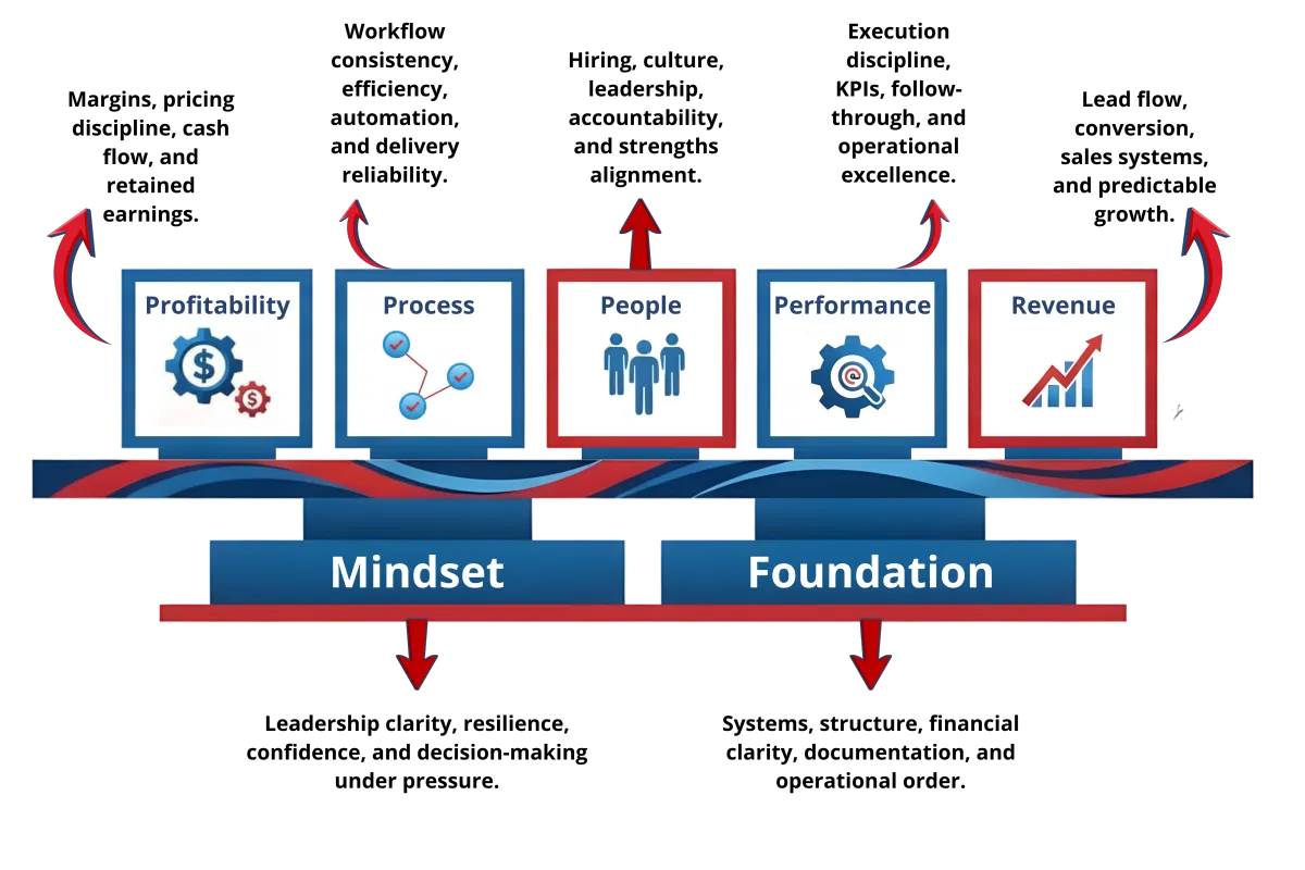 Every business operates on the same seven structural pillars. When these pillars are strong and balanced, the business moves forward with speed and stability. When one is weak, everything feels harder than it should.